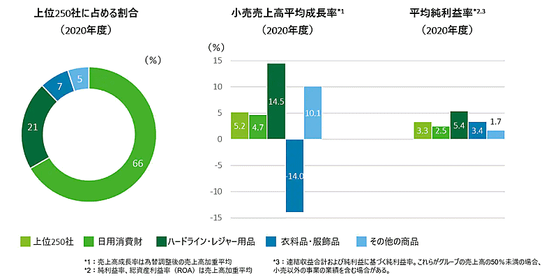 上位250社の総小売売上高は5兆1000億米ドル(前年度は4兆8500億米ドル)、平均小売売上高は204億米ドル(前年度は194億米ドル)。2015年度から2020年度における小売売上高の年平均成長率は4.7%となった。