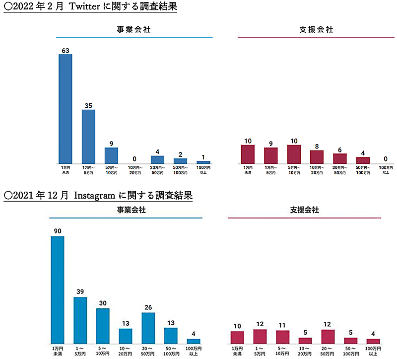 「1万円~10万円未満」では、Instagramが70.1%だったのに対し、Twitterは84.4%となり、Instagramに比べてTwitterの方が低予算で運用されていることがわかった。