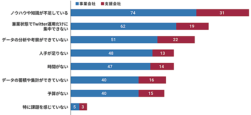 Twitter運用上の課題について聞いたところ、トップは「ノウハウや知識が不足している」(64.9%)で、次いで「兼業状態でTwitterだけに集中できない」(54.4%)「データ分析や考察ができていない」(44.7%)だった。
