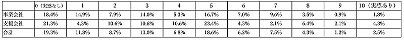Twitterが自社のビジネスに貢献している度合いについて、11段階評価で評価してもらったところ、「実感なし(0)」が最多で19.8%だった。「実感あり(10)」は2.5%で、ビジネスとしてTwitterを有効活用できていない企業が多いことがわかった。