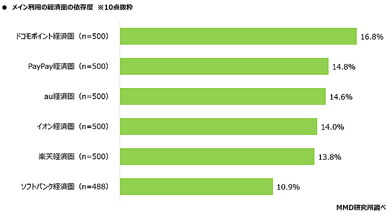 予備調査から6つの経済圏のメイン利用者2988人を抽出し、メインで利用している経済圏の依存度を10点満点で聞いたところ、10点の比率は「ドコモ経済圏」が16.8%で最も多く、次いで「PayPay経済圏」が14.8%、「au経済圏」が14.6%だった。