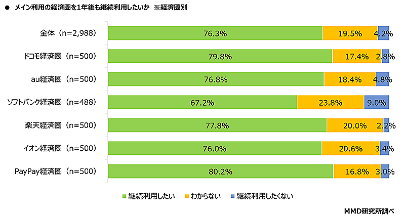 経済圏別に見ると、「継続利用したい」の回答は「PayPay経済圏」が80.2%で最も多く、次に「ドコモ経済圏」が79.8%、「楽天経済圏」が77.8%だった。