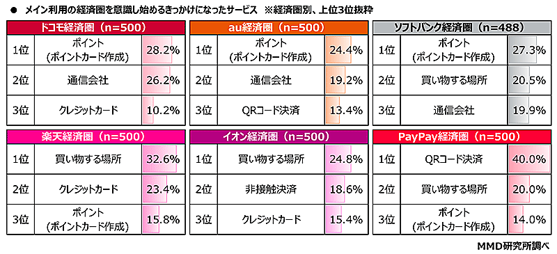 6つの経済圏のメイン利用者に、メイン利用の経済圏を意識し始めるきっかけとなったサービスを聞いたところ、「ドコモ経済圏」「au経済圏」「ソフトバンク経済圏」は「ポイント(ポイントカード作成)」がトップだった。