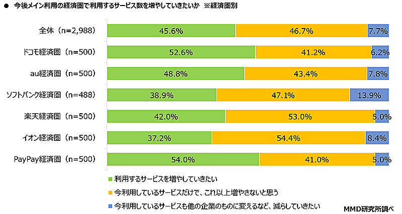 6つの経済圏のメイン利用者に、今後メイン利用の経済圏で利用するサービス数を増やしていきたいか聞いたところ、45.6%が「増やしていきたい」と回答した。