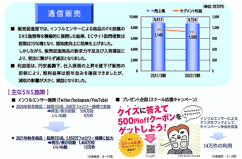当期の通販事業において、販促施策では「ツイッター」、「インスタグラム」、「ユーチューブ」を活用して前年度以上の規模でインフルエンサーによるPR投稿を展開した。前年度は秋冬商品についてインフルエンサー152人を起用し、合計540万フォロワーの規模で実施。再生・表示回数では550万回、「いいね数」では9万件を得ることができた。