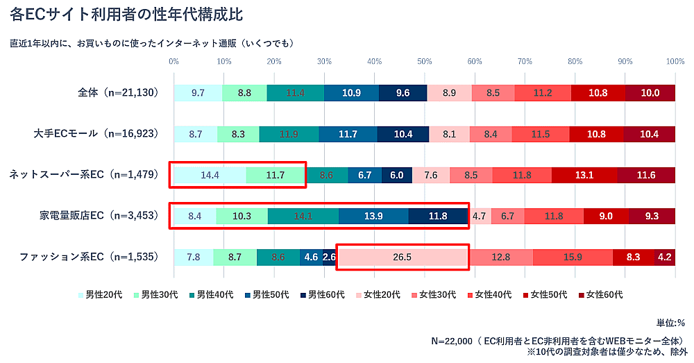 ECサイトのジャンルによって利用者の性年代構成比が異なることが浮き彫りになった。