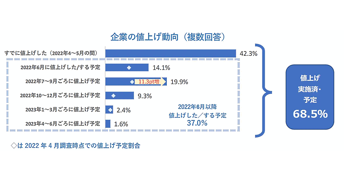 調査結果によると、2022年4月以降に値上げした・する企業は68.5%。2022年6月以降に「値上げした・もしくはする予定」の企業は37.0%。42.3%の企業が「2022年4月~5月の間にすでに値上げした」と回答。「2022年6月に値上げした・する予定」は14.1%、「2022年7月~9月ごろに値上げ予定」は19.9%、「2022年10月~12月ごろに値上げ予定」は9.3%。企業は今後も値上げを考えていることがわかった。