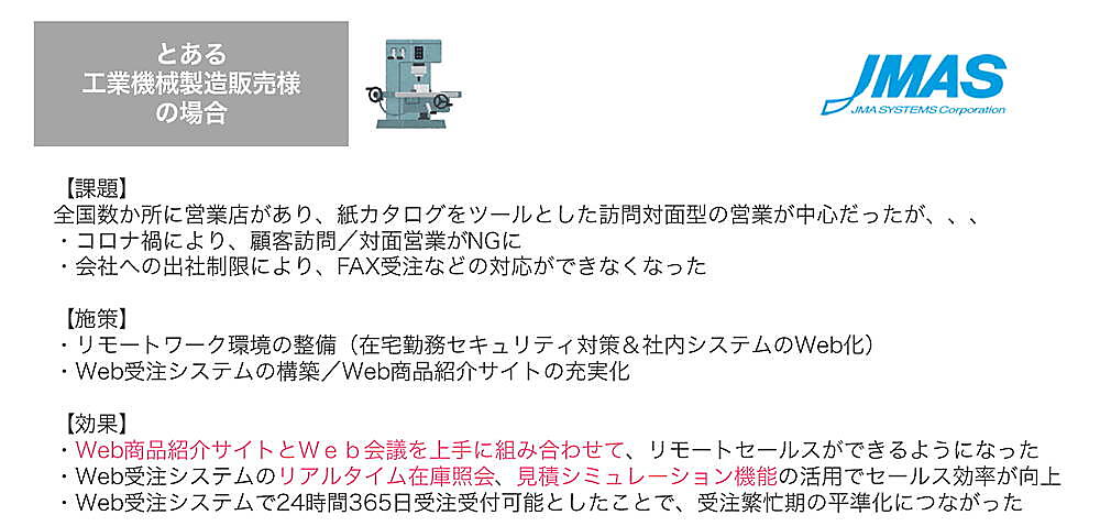 ジェーエムエーシステムズ 営業部 統括マネージャー 岸直之氏(以下、岸氏):工場向け機械の製造販売をする企業様のケースを紹介します。