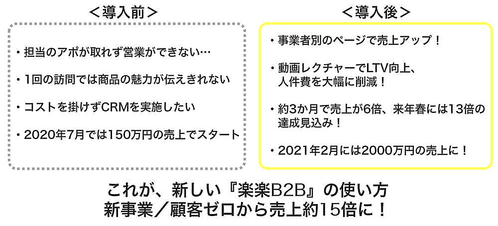 三宅氏:これからは、業務効率化という守りの話しだけではなく、売り上げを増やすための攻めの姿勢が大事になるでしょう。営業が直接出向いて交渉し、受発注はFAXというスタイルの化粧品関係の会社の例ですが、アポが取れなくなり営業ができず、顧客がゼロに近い状態で月商は150万円程度まで落ち込みました。2020年7月に「楽楽B2B」を導入して、それを機にオンラインマーケティングに集中。多くのサンプルを送付し、届いた頃にオンラインで「どうでしたか」と確認、良かったという返答を得た企業に「買いませんか」とプッシュするという攻めのスタイルに転換しました。合わせてメルマガも配信することで、約3か月で売り上げは8倍になり、2021年2月には15倍の2000万円を達成したそうです。