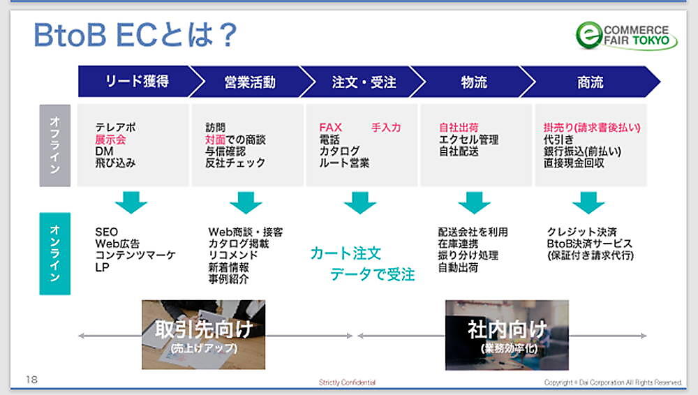 BtoBはアナログな体制で業務フローを構築していたのですが、コロナの影響でデジタル化が進んでいます。BtoB-ECは、取引先との接点を強化し、社内の業務を効率化することができます。