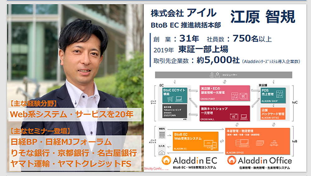 アイル BtoB-EC推進統括本部・江原智規氏(以下江原氏):お得意先から、「御社は電話やファックスだけなのか、ネットで注文できるところが増えてきているよ」と指摘され、重い腰をあげるという企業も増えましたよね。