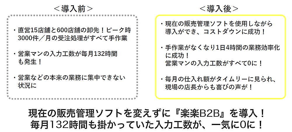 三宅氏:コーヒー豆などを扱っているクライアントの事例ですが、そこでは営業マン自身が契約してきたお客さまの発注を、手作業で打ち込んでいました。直営店15店舗と卸先600店舗を抱えているので、ピーク時は月に3000件の受注処理が生じ、入力工程は毎月132時間に達しました。そこで、既存の販売管理ソフトを変えずに、「楽楽B2B」を導入したことで、手入力がゼロに。現地に行って営業マンに話しを聞いたところ、「これを待っていました」「ありがとうございました」と言っていただけました。