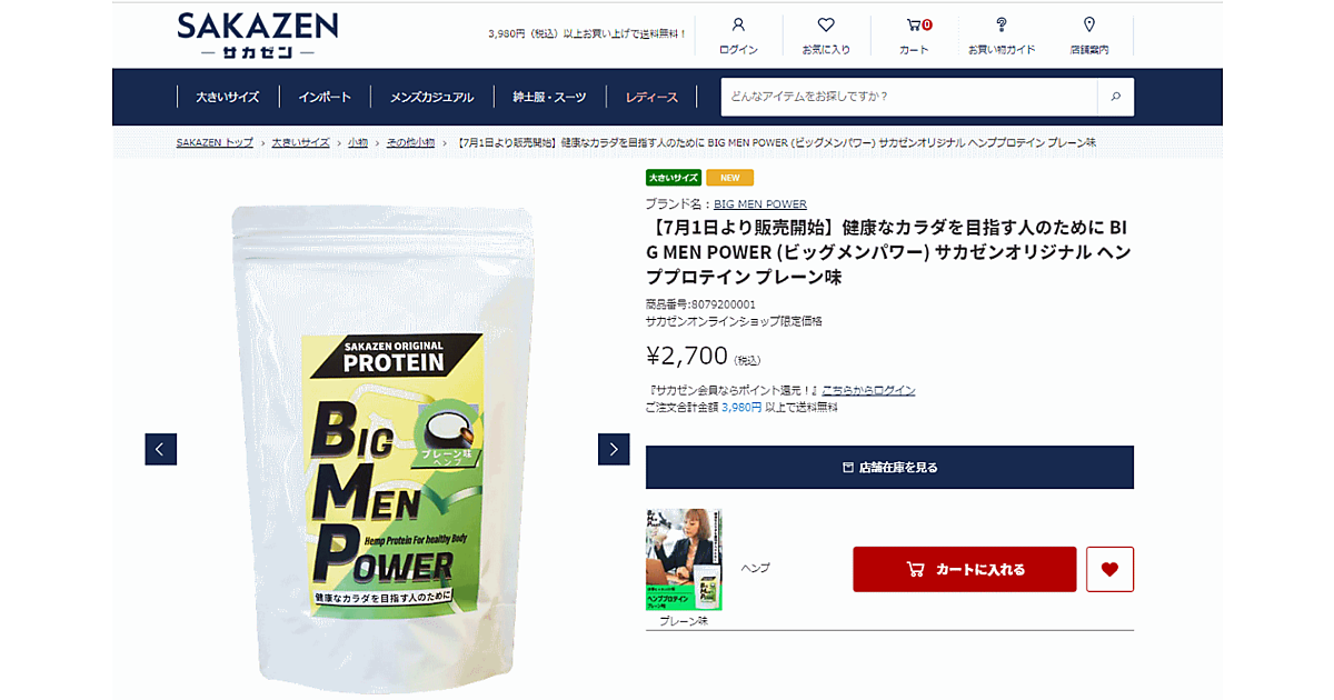 大きいサイズのメンズ服・小物などの「サカゼン」を展開する坂善商事は、オリジナルプロテイン「BIG MEN POWER」の販売を7月1日に始めた。