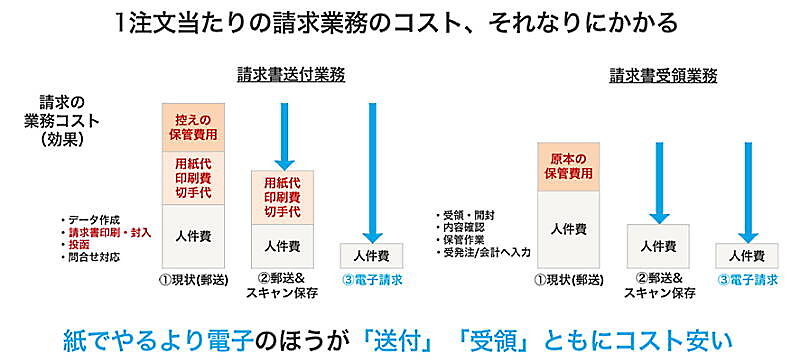 岡本氏:はい、そうです。請求書の発行・発送業務や新規顧客の与信などを人の手で管理してしまうと、その業務のための人件費や郵送代、紙の請求書の保管費用、保管期限が過ぎたものの破棄費用などがコストとしてかかってきます。図で表すとよくわかるのですが、請求業務には思っている以上に費用が発生しているのです。
