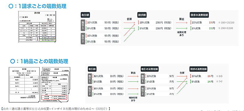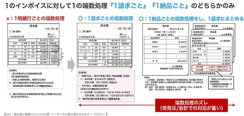 岡本氏:ここも重要ですね。消費税の計算は、これまで認められていた1明細行ごとの端数処理が認められなくなり、「1請求ごとで計算するのか」「1納品ごとで計算するのか」の二択になります。端数処理のズレを考慮したり、キャンセルや返品があると計算がさらに複雑になります。これらを毎回人の手で計算するというのは現実的ではないので、システムで対応する必要があると言えます。しかし、多くの会社 がこの問題に気付いていないのが現状。これからシステムを導入するのであれば、きちんとインボイス制度の消費税計算に対応しているサービスを選んでいただきたいですね。