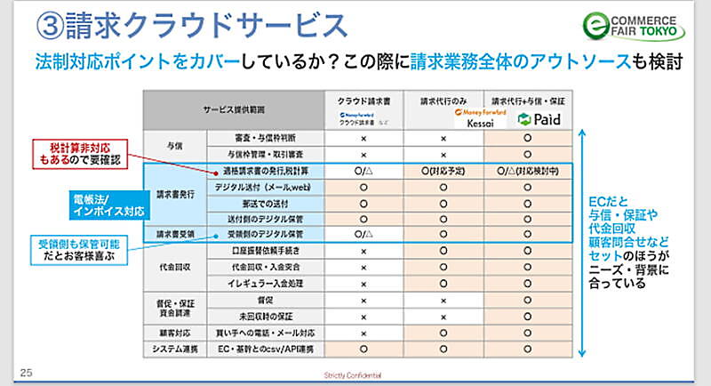 岡本氏:適格請求書の発行や税計算、受け取る側のデータ保存も対応できるサービスなのか否かを調べてほしいですね。新たにサービスを導入するというのであれば、与信・保証、代金回収、顧客問い合わせなどもセットになっているような決済サービスを選ぶと良いでしょう。