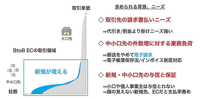 ラクーンフィナンシャル Paid推進部長 執行役員 及川哲哉氏(以下、及川氏): BtoBにおいて、大手同士の取引はEDI(電子データ交換)を使っていることが多く、BtoB-ECは中小企業との取引が中心となります。また、請求書払いが多く、掛け売りのニーズが高いのが特長で、それに対応できるサービスが必要となっています。
