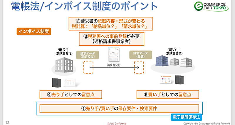 岡本氏:2023年10月から始まるインボイス制度は、BtoB-ECをやる・やらないに関係なく、すべての企業が対応しなくてはならない制度です。この制度におけるポイントは5つあり、そのなかで、売り手側・買い手側の双方に関わるのが保存要件です。請求書を発行する側も受け取る側も、請求書を7年間保存しなければなりません。保存スペースも必要ですし、破棄の費用もかかりますよね。