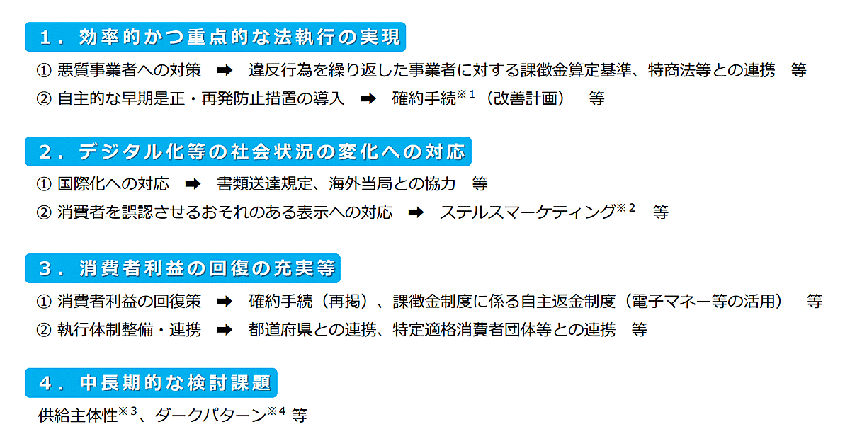 今会合の冒頭、若宮健嗣消費者担当大臣は、挨拶のなかで「メリハリのある執行の実現」を要請。確約手続き導入による柔軟な行政措置、悪質業者への制裁強化を念頭に置いた発言とみられる。ステマへの対応、問題の整理も改めて要請した。