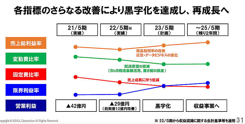 アスクルのBtoC事業は2022~23年に収益改善を図り、営業損失の黒字転換を狙う。売上総利益率、変動費比率、固定費比率、限界利益率、営業利益のさらなる改善によって黒字化を達成し、再成長をめざす。具体的には、商品粗利率の改善、広告・データビジネスの進化、BtoB物流基盤の基盤の活用と置き配の推進による配送原価の低減、売り上げ成長に伴う固定費比率の低減に取り組む。