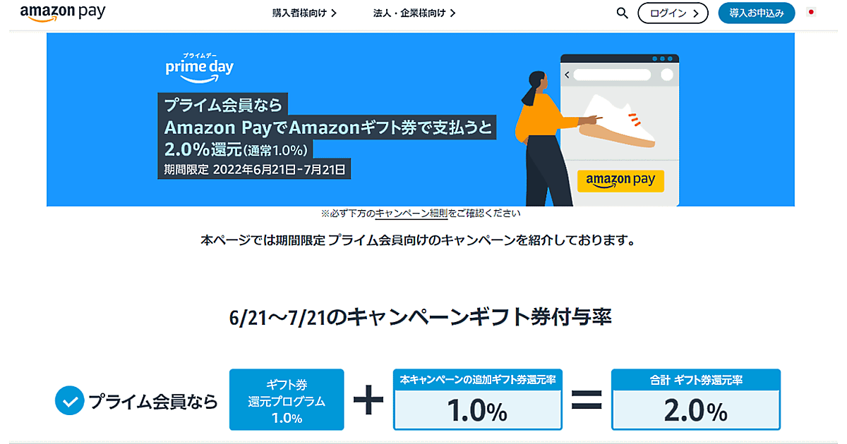 アマゾンジャパンは、「Amazon Pay」を導入している自社ECサイトでの買い物において、プライム会員の消費者がAmazonギフト券の残高を使い「Amazon Pay」で商品・サービス代金を支払った場合、ギフト券での支払い金額の2.0%をAmazonギフト券残高で還元する取り組みを期間限定で実施している。