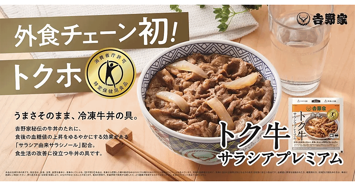吉野家は外食チェーンで初めて特定保健用食品の許可を獲得した冷凍牛丼の具「トク牛サラシアプレミアム」を開発し、「吉野家公式通販ショップ」のほか、各ECモール店、イオン、イオンスタイル(北海道・九州・沖縄を除く)で販売を始めた。