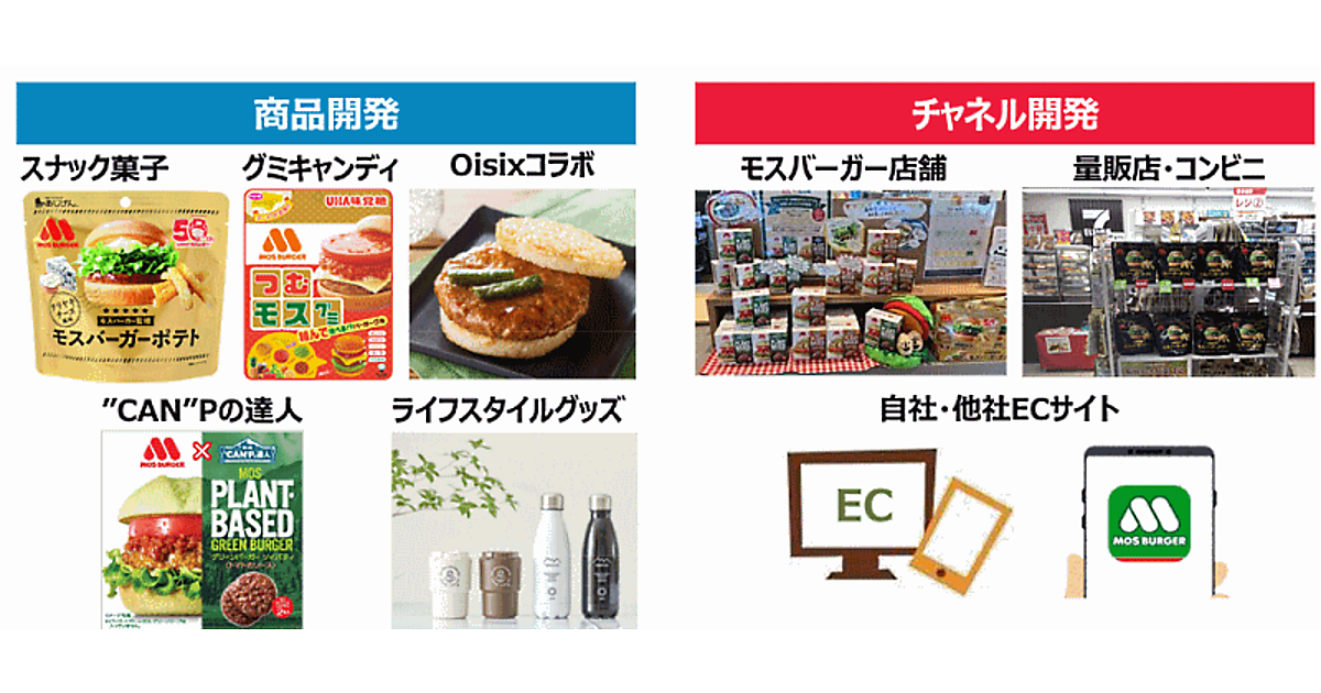 モスフードサービスは2022年4月からスタートしている3か年の中期経営計画で、商品開発と販売チャネル開発を掲げた。商品開発の一環ではオイシックス・ラ・大地とのコラボ商品やライフスタイルグッズを開発。チャネル開発では、モスバーガー店舗の店頭に加え、量販店、自社・他社のECサイトなど新たな販売チャネルを開発を掲げている。