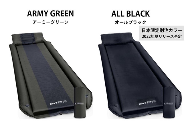 『IFORRESTインフレーターマット』選べる2カラーまずはアメリカで1番人気のアーミーグリーンが先行上陸します。オシャレなキャンパーの皆様に向けて、日本別注カラーのオールブラックも2022年の夏頃リリース予定です。