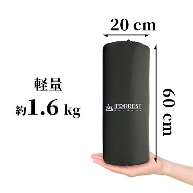 コンパクトに収納でき、持ち運びも便利収納時は横20cm、縦60cmとコンパクトサイズになります。いざという時の防災用品としても、場所をとらず便利です。そして重量は約1.6kgと一般的なインフレーターマットと比べて軽量で、持ち運びも便利です。