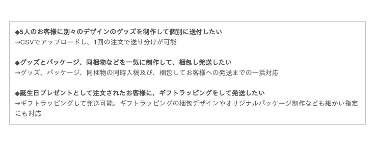 オリジナルグッズやノベルティ制作だけでなく、オリジナルパッケージや同梱物の制作も可能です。また、この商品にはこのデザインのパッケージ、というように発送先のお客様によってパッケージを個別に選択することもできます。