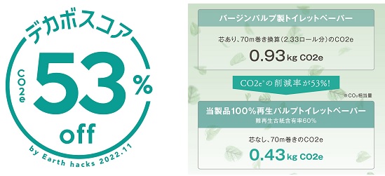 ■環境に配慮した製造工程でデカボスコア*53%オフを達成当社では、限りある資源を有効活用するために、独自の古紙再生技術を駆使した古紙100%のトイレットペーパーやティシューペーパーを製造しており、製造工程による二酸化炭素(CO2)排出量の削減に努めています。また、難再生古紙再生システムの導入により、それまで焼却されていた雑がみ・機密文書などの再資源化を可能にしました。今回発売する『Smart Flower』のトイレットペーパーは、バージンパルプ製トイレットペーパーと比較し、排出CO2相当量の削減率を示すデカボスコア「53%オフ」を達成。ネット限定の直販とすることで輸送効率を高め、さらなるCO2の削減を実現します。