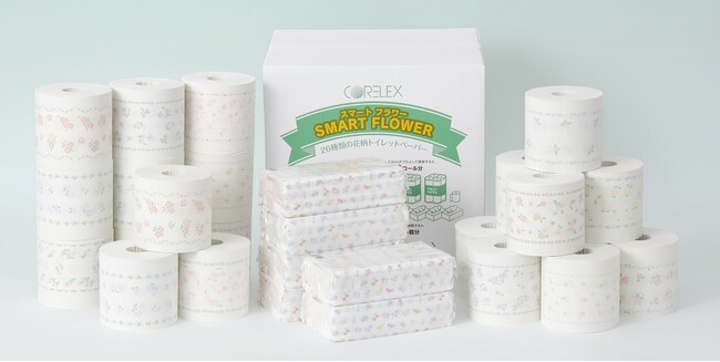 独自の古紙再生技術で“にっぽんの暮ら紙”を提案するコアレックス信栄株式会社(本社:静岡県富士市、 代表取締役社長:黒崎 暁)は、環境に配慮した花柄の芯なしトイレットペーパー「ワンタッチふわはな」〈70mダブル×21ロール〉とティシューペーパー「花いっぱいティシュー」〈200組(400枚)×6個〉をセットにした『Smart Flower(スマートフラワー)』(3,000円/税込)を新発売。11月30日(水)より、当社のECサイト「まーくんのエコショップ」(https://corelex.jp/shop/item/g1011.html)およびAmazon(https://www.amazon.co.jp/dp/B0BNHMFXS5)で販売を開始しました。