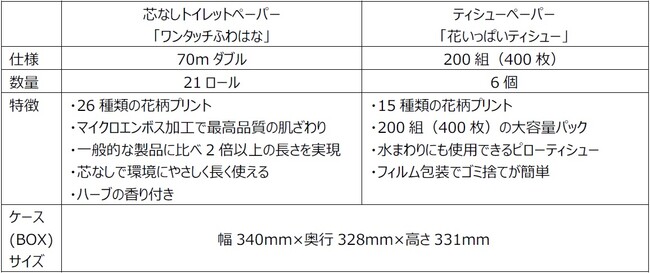■品質・機能性も追求「ワンタッチふわはな」は、マイクロエンボス加工によるふっくらとした肌ざわりと高級な質感や、さまざまなハーブをミックスさせた華やかな香りで心地よいプライベート空間を演出、「花いっぱいティシュー」は、紙箱不使用のフィルム包装により使用後のゴミ捨てが簡単にできるなど、品質や機能性も追求しました。