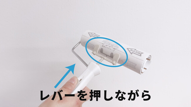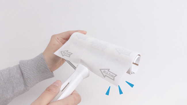 レバーを押しながら、テープを手前に回すだけで簡単にめくれます!開発にかかった期間は4年です。今までにない形の粘着クリーナーであるため成形が難しく、またテープの粘着部分にもこだわって作ったため開発に時間を要しました。