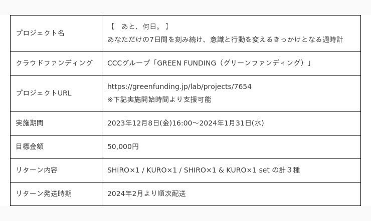 デザインスタジオ SATORU UTASHIRO DESIGN(東京都)は、モノをきっかけに行動や気持ちに変化が生まれ、その人の物語がほんのちょっと豊かに動き出した「それから」の物語になることを目指したプロダクトブランド「sorekara (それから)」を立ち上げました。その第一弾商品として発表する「あと、何日。」という、今までにない視点から時を刻む時計をCCCグループのクラウドファンディングサービス「GREEN FUNDING(グリーンファンディング)」にて支援募集。実施期間は2023年12月8日(金)~2024年1月31日(水)を予定しています。