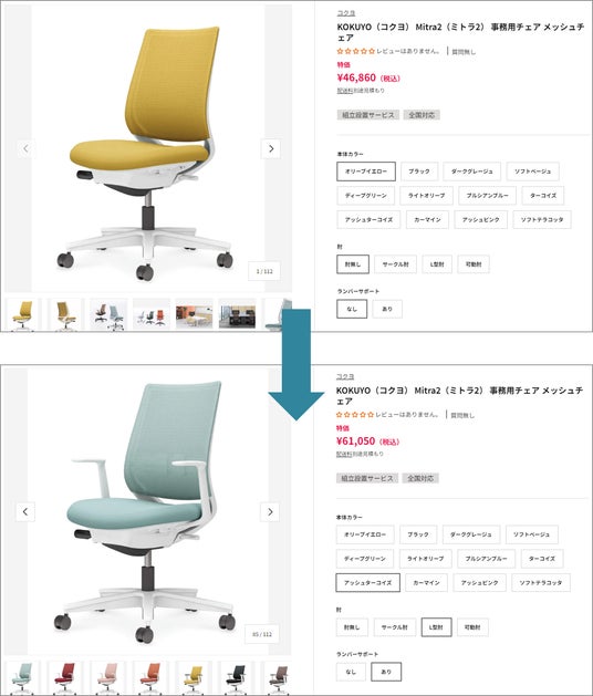 2.商品を選定しやすいUIデザイン商品はカテゴリやメーカー、金額、カラー、サイズ等で絞り込むことができ、商品の選定がスムーズに行えます。また、同一商品のカラー変更やオプション追加はページ遷移が不要で、操作性の高いUIを実現しています。