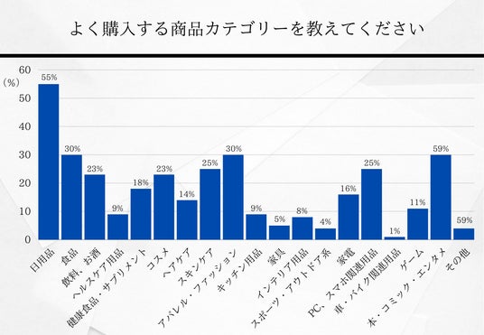 「日用品」が55%で最も購入されており、「食品」(30%)、「スキンケア」(25%)、「アパレル・ファッション」(30%)も高い割合を占めています。これらの商品カテゴリーは、消費者の日常生活に密接に関連していることが特徴です。