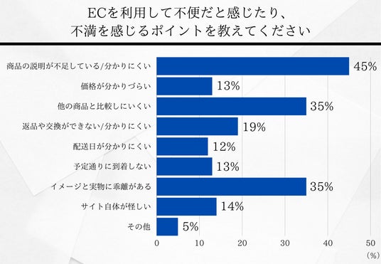 調査結果によると、消費者がEC利用において最も不便や不満を感じているのは、「商品の説明が不足している/分かりにくい」(45%)という点でした。次いで、「他の商品と比較しにくい」(35%)や「イメージと実物に乖離がある」(35%)といった点が挙げられています。これらの結果から、消費者がECサイトにおいて商品選びに関して不安や不便を感じていることが浮き彫りになっています。