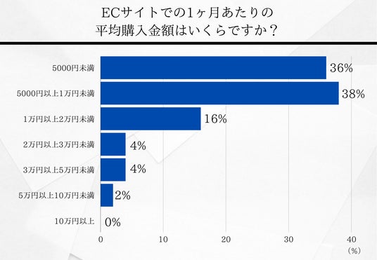 調査結果によると、ECサイトでの1ヶ月あたりの平均購入金額が「5000円以上1万円未満」の層が38%で最も多く、次いで「5000円未満」が36%を占めています。この二つの層で全体の73.57%を占めており、「1万円以上2万円未満」も含めると90%にのぼります。
