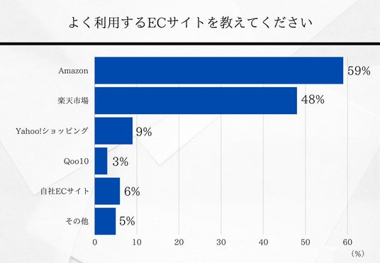 「Amazon」が59%で最も多く利用されており、「楽天市場」(48%)、「Yahoo!ショッピング」(9%)が続いています。これにより、主要なECプラットフォームが消費者に強く支持されていることがわかります。