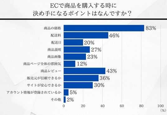 商品の購入を決定する際の最重要ポイントとして「商品の価格」(83%)が圧倒的に多く、次いで「配送料」(46%)や「商品レビュー」(43%)が続いています。