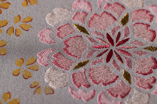 箔と金泥が生み出す格式高い文様金銀箔や金泥は、豪華で格式高さを表現する技法として、古くから使われていますが、繊細な刺繍と組み合わせることで、金銀箔や金泥が醸し出す光沢と、緻密な糸使いによる刺繍の美が融合し、上品でありながらも豪華で格式高い文様を表現します。