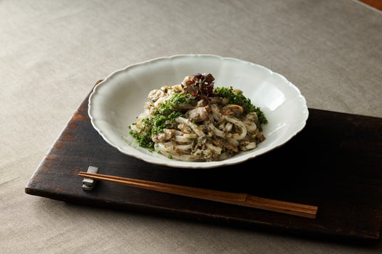 青のりの中でも特に香り高く、海藻界の「香りの王様」ともいわれるシーベジタブルの「すじ青のり」をふんだんに使い、東京深川名物のアサリを混ぜ合わせることで磯の香りをより楽しんでいただけるうどんに仕上げました。すじ青のりには、鉄やカルシウム、ビタミンA、ビタミンB12といった栄養素が豊富に含まれ、うま味成分であるグルタミン酸も豊富なことから、素材の味わいを一層引き立てます。