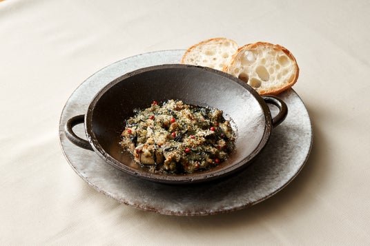 厳選されたつぶ貝と帆立が、シーベジタブルの「すじ青のり」を練り込んだ特製バターとともに、ブルゴーニュ風に仕上げられています。すじ青のりの豊かな香りとバターの滑らかなコクに加え、柔らかくエグみがほとんどないシーベジタブルの「若ひじき」の味わいが、つぶ貝と帆立の甘みを引き立てます。一口ごとに広がる海とバターの芳醇(ほうじゅん)な香りで、贅沢(ぜいたく)な時間をお楽しみください。