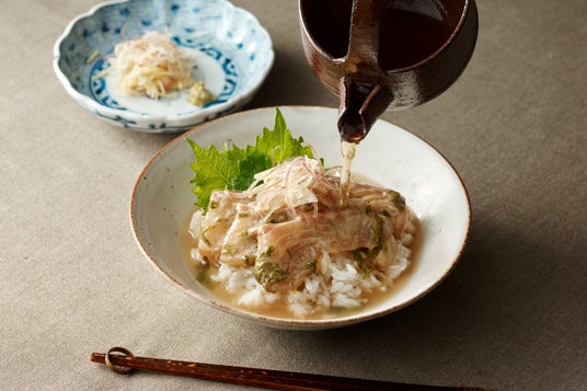 一般的なアオサに比べて厚みがあり、ほろ苦さと味わいの濃さが特徴のシーベジタブルの「生あつばアオサ」を使い、鯛(たい)と海藻の新しい食感を追求しました。生あつばアオサが持つみずみずしい磯の香りと、香ばしい胡麻の風味が鯛茶漬けのタレと絶妙に調和し、シンプルながらも贅沢な味わいに。海と大地の恵みを存分に感じていただける、特製お出汁を使った上品な鯛茶漬けです。