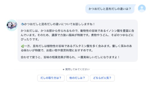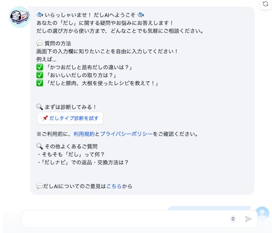 まるで「だしの専門家」に直接質問しているような体験を通じて、だしをもっと身近に、もっと手軽に活用できるようサポートします。