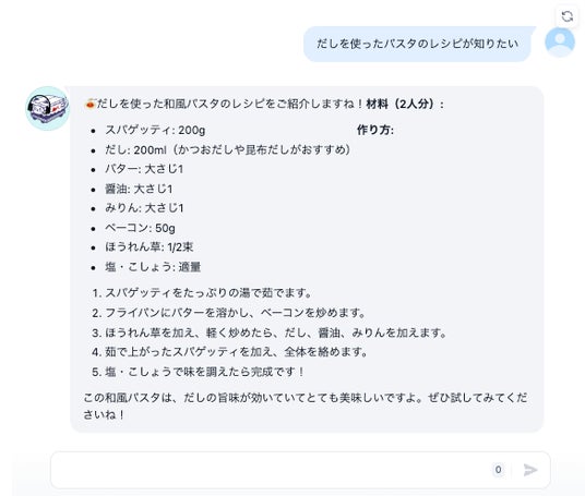 レシピ検索にも対応しているので、冷蔵庫の中にある材料を入力すればだしを使ったレシピをチャットボットがご提案することも可能。ぜひ『だしAI』を生活の中に取り入れていただけると嬉しいです。