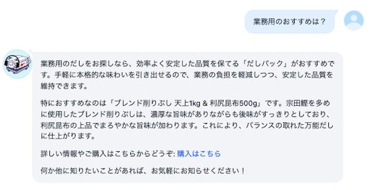 商品選びのサポート「こんな料理に合うだしを知りたい」「業務用のおすすめは?」といった質問に対し、最適な商品を提案。
