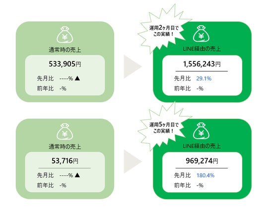 実際の成果として、ある企業では運用開始2ヶ月でLINE経由の売上が150万円を突破。訪問者数は前月比49.9%増、転換率も32.7%を記録しました。別の企業では、売上が通常時の約3倍となり、転換率も75.5%に達するなど、明らかな改善が見られています。