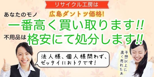 リサイクル工房は広島県で利用者ナンバーワンを誇る出張買取専門店です。年間問い合わせ件数は実に1万件を突破。高価買取はもちろん、不用品処分にも対応し、家の中まるごと処分・買取、遺品整理や引っ越しなど、幅広いニーズに応えています。その他、事業者の閉店・移転に伴う在庫品処分やビジネス用品の買取も対応可能です。